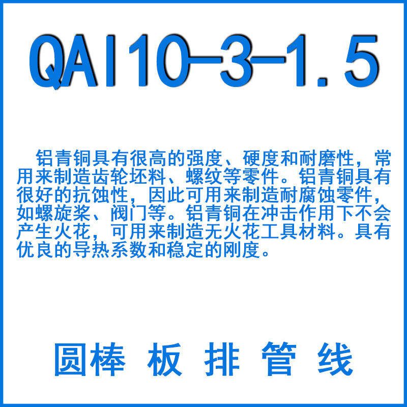QAl10-3-1.5為含有鐵、錳元素的鋁青銅,有高的強度和耐磨性,經(jīng)淬火、回火后可提高硬度,有較好的高溫耐蝕性和抗氧化性,在大氣、淡水和海水中抗蝕性很好,可切削性尚可,可焊接,不易纖焊,熱態(tài)下壓力加工良好。