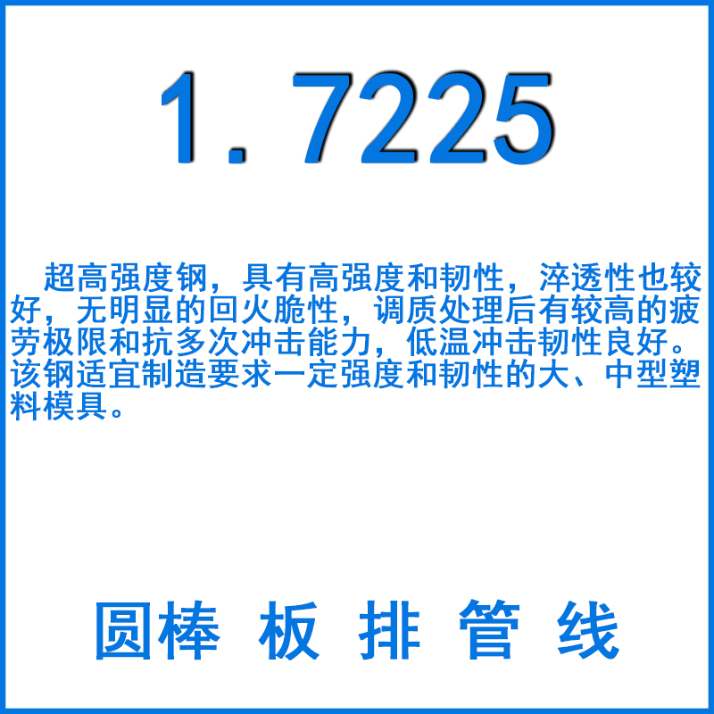 1.7225鋼材,此鋼擁有良好的加工性,加工變形微小,抗疲勞性能相當(dāng)好,屬中等等淬透性鋼,1.7225熱處理后有較好的強(qiáng)度和良好的綜合力學(xué)性能,工藝性好,成材率高.最高使用溫度為427攝氏度.1.7225強(qiáng)度、淬透性高,韌性好,淬火時(shí)變形小,高溫時(shí)有高的蠕變強(qiáng)度和持久強(qiáng)度。用于制造要求較35CrMo鋼強(qiáng)度更高和調(diào)質(zhì)截面更大的鍛件,如機(jī)車(chē)牽引用的大齒輪、增壓器傳動(dòng)齒輪、后軸、受載荷極大的連桿及彈簧夾,也可用于 2000m以下石油深井鉆桿接頭與打撈工具,并且可以用于折彎?rùn)C(jī)的模具等。