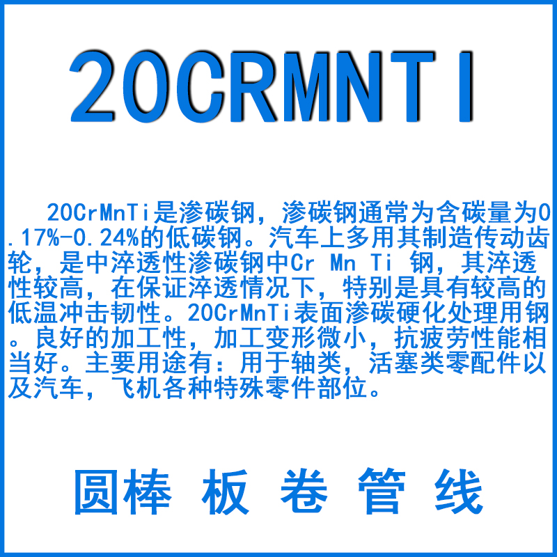 20CrMnTi是表面滲碳硬化處理用鋼。滲碳鋼通常為含碳量為0.17%-0.24%的低碳鋼。汽車上多用其制造傳動齒輪,是中淬透性滲碳鋼中Cr Mn Ti 鋼,其淬透性較高,在保證淬透情況下,特別是具有較高的低溫沖擊韌性。經滲碳淬火后具有硬而耐磨的表面與堅韌的心部,具有較高的低溫沖擊韌性,焊接性中等,正火后可切削性良好。用于制造截面<30mm的承受高速、中等或重載荷、沖擊及摩擦的重要零件,如齒輪、齒圈、齒輪軸十字頭等。是18CrMnTi的代用鋼,廣泛用作滲碳零件,在汽車.拖拉機工業用于截面在30mm以下,承受高速.中或重負荷以及受沖擊.摩擦的重要滲碳零件,如齒輪.軸.齒圈.齒輪軸.滑動軸承的主軸.十字頭.爪形離合器.蝸桿等。具有良好的加工性,加工變形微小,抗疲勞性能相當好。主要用途有:用于軸類,活塞類零配件以及汽車,飛機各種特殊零件部位。